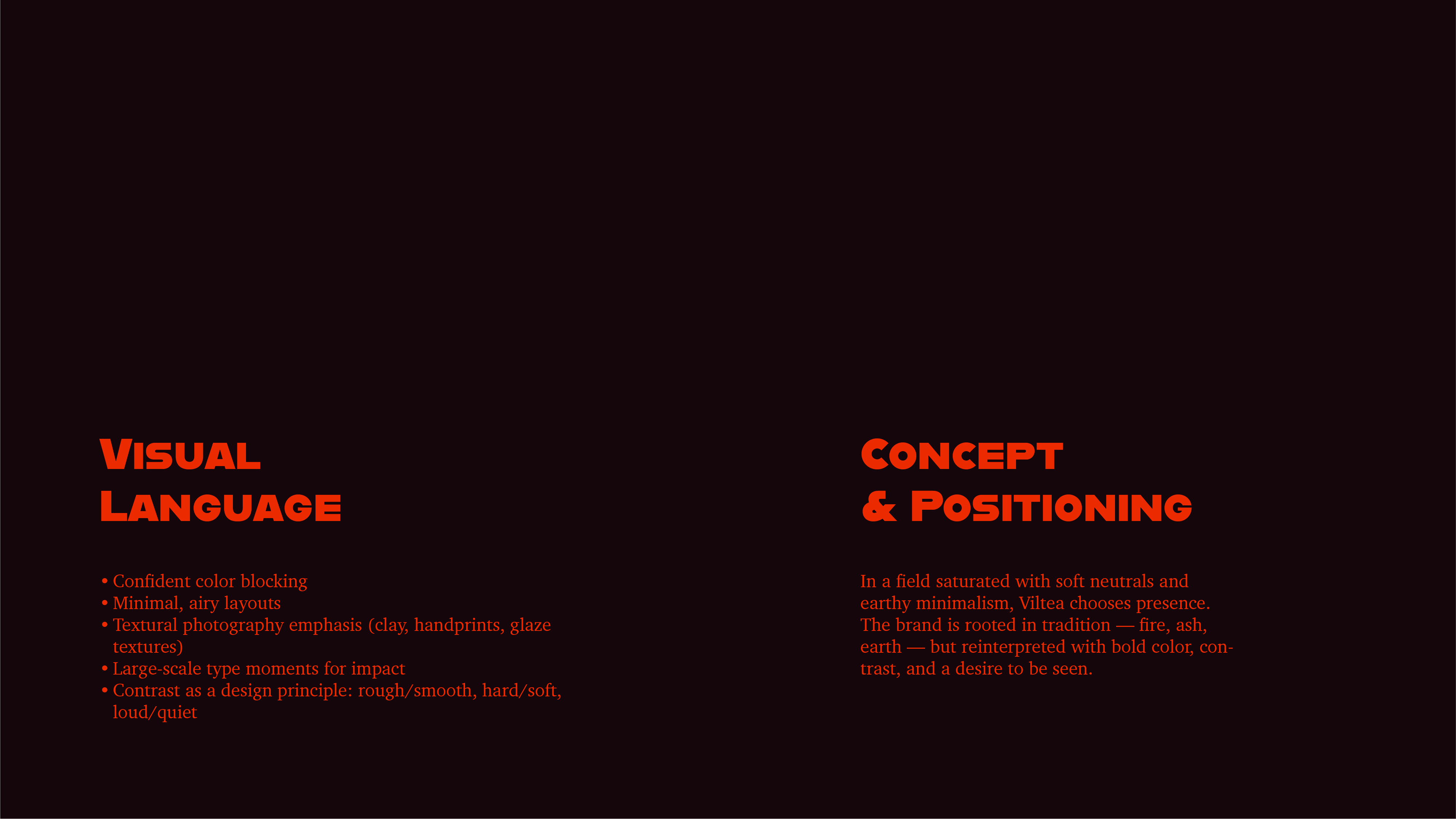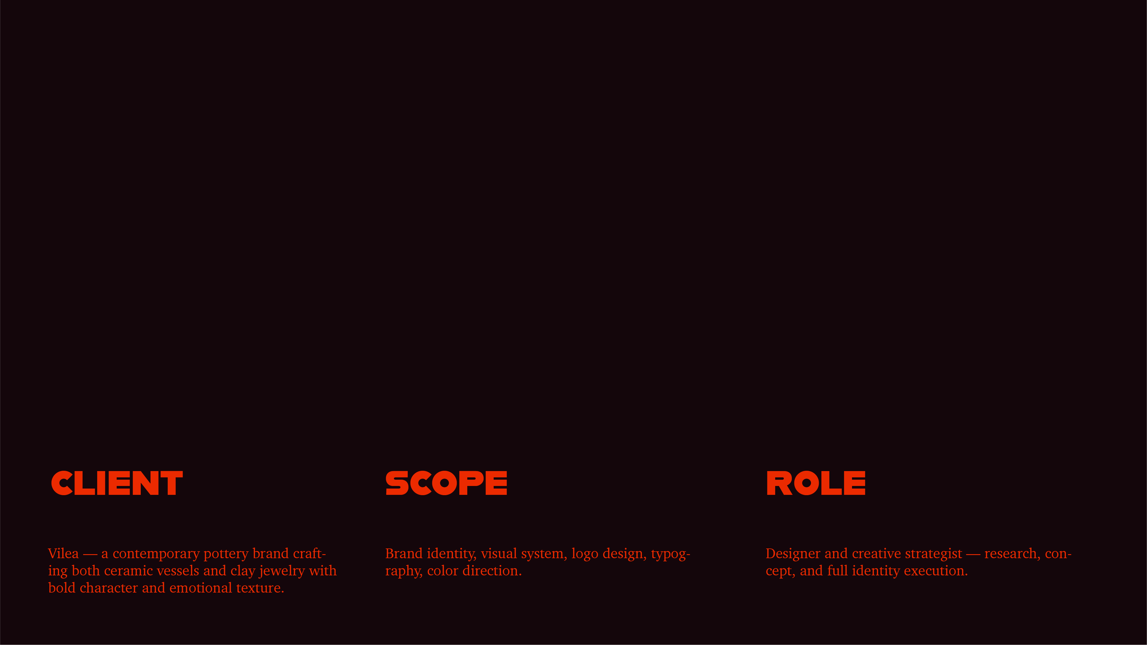 Vilea is a contemporary pottery brand crafting both ceramic vessels and clay jewelry with bold character and emotional texture. My role as a designer was to create a distinctive visual language that would be representative of lively Vilea community, as well as to help the brand to present itself as a new, original and bold new name in the pottery and clay design world.